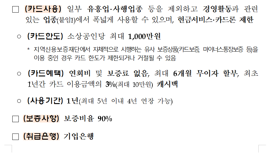 - 정부, 지역신용보증재단, IBK기업은행 협업으로 발급되는 특례보증 기반 신용카드