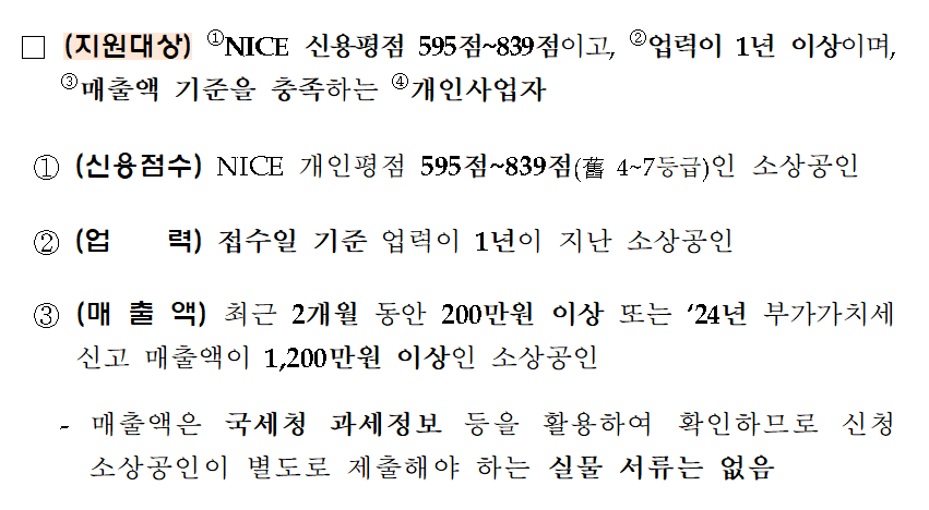 - 매출 요건: 최근 2개월 매출 200만원 이상 또는 2024년 부가세 신고 매출 1,200만원 이상