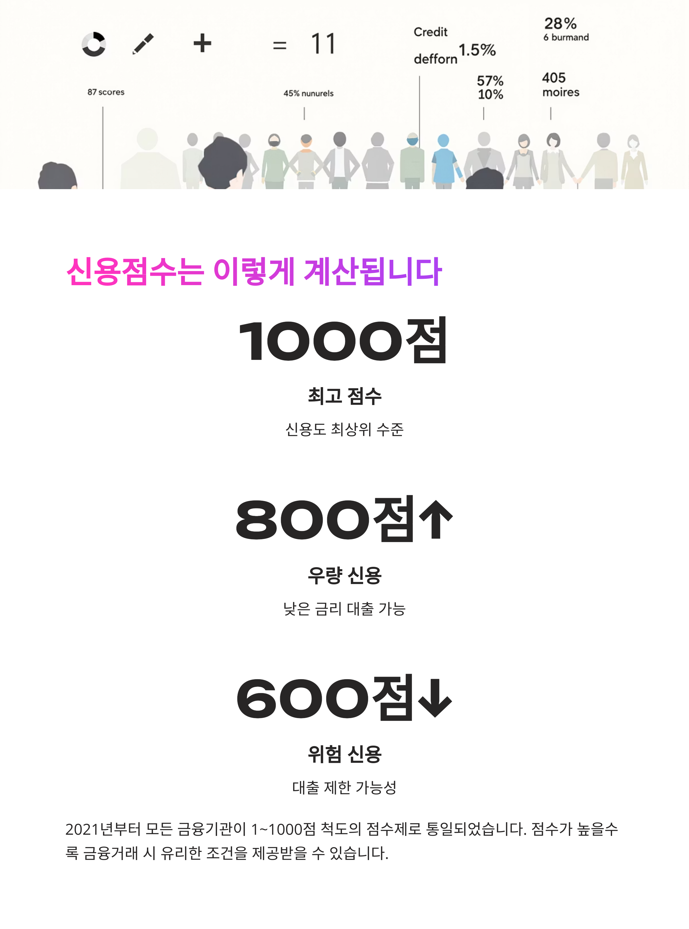 - NICE (나이스): 금융거래 이력, 연체이력, 대출 종류 중심으로 점수 산정