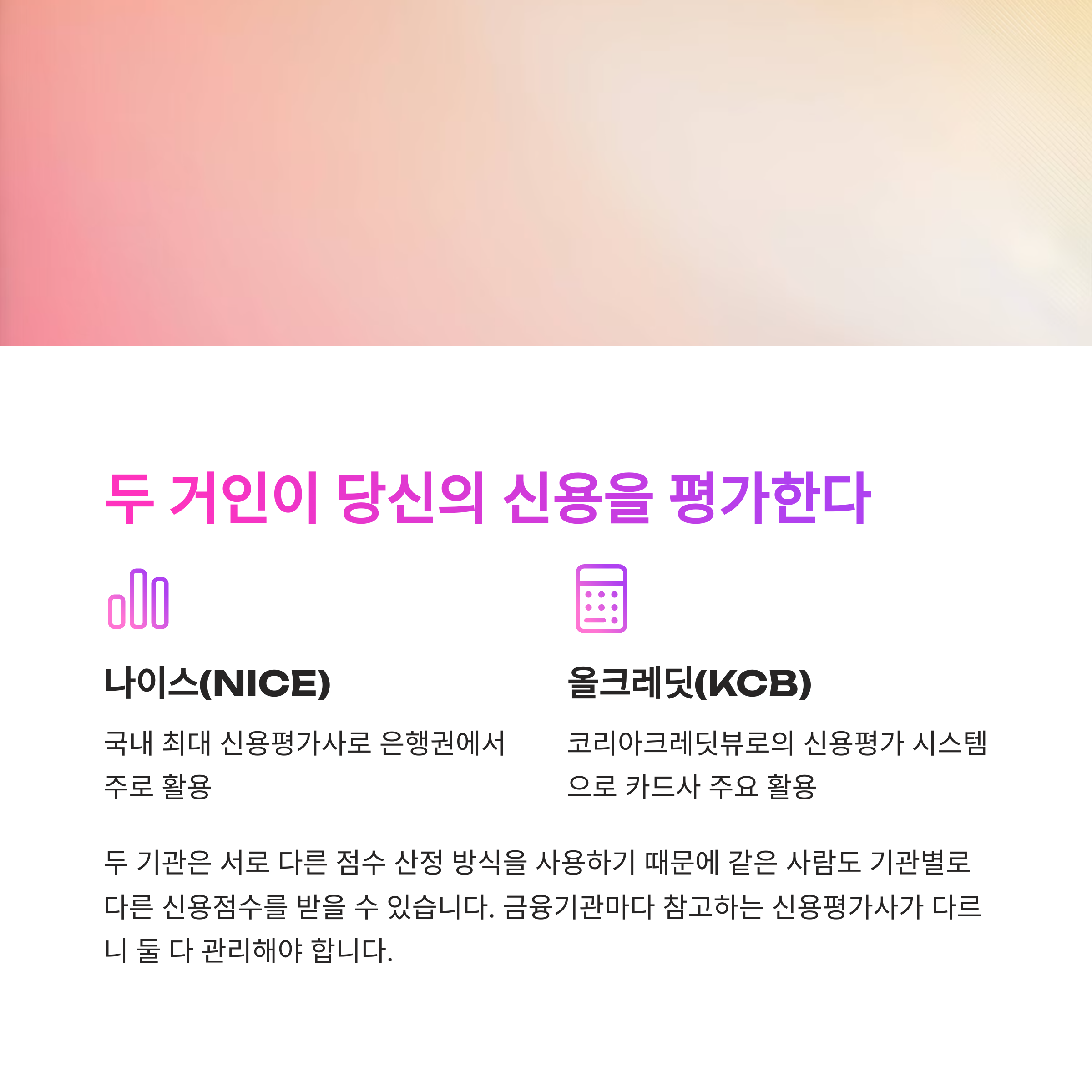 💡 같은 사람이라도 NICE는 850점, KCB는 880점처럼 점수가 다를 수 있어요.