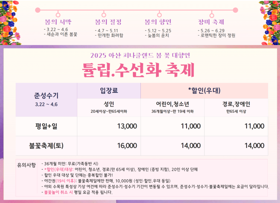 튤립 축제로 유명한 충남 아산 피나클랜드 수목원에서 야경·꽃·불꽃놀이를 한 번에 즐길 수 있는 단 하나의 봄 축제가 열립니다.