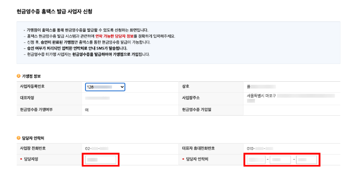 5. 가맹점 정보 항목에서 사업자등록번호를 선택하고, 담당자 연락처 항목에서 담당자명과 담당자 연락처를 입력 후