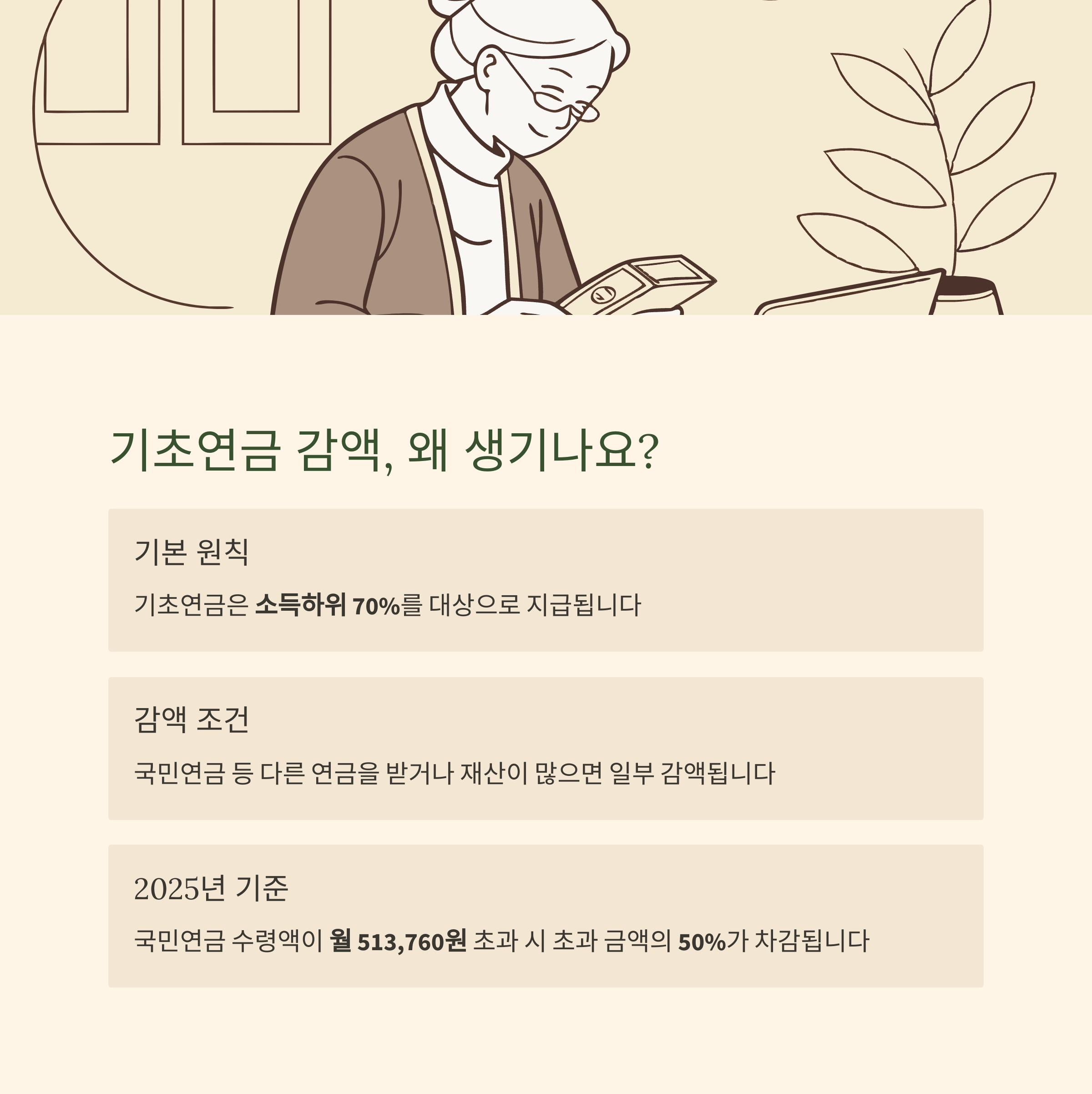 기초연금은 기본적으로 소득하위 70%를 대상으로 하지만, 국민연금처럼 다른 연금을 받거나 재산이 많으면 일부 감액됩니다.