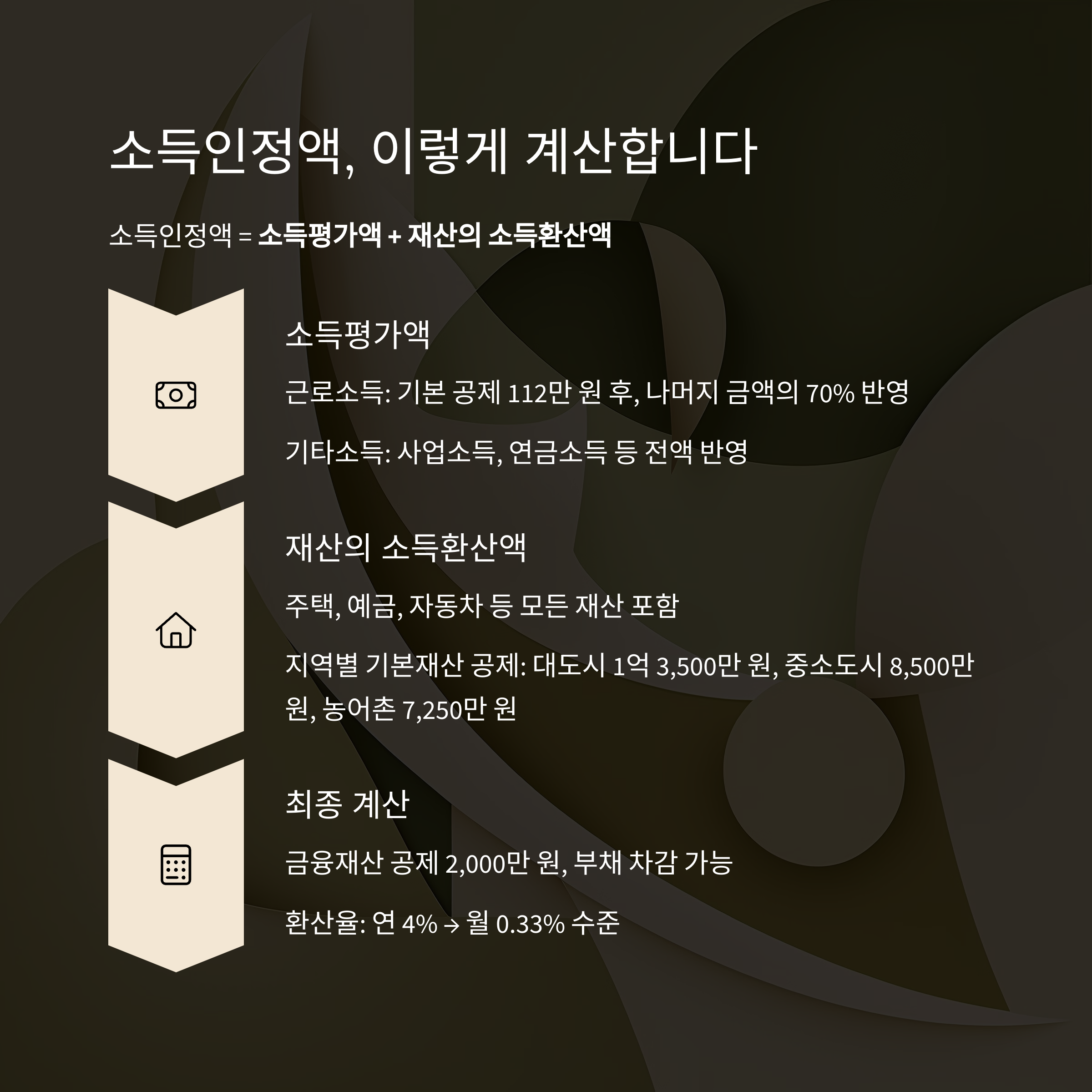 | 최종 계산식 | (재산 - 공제금액) × 4% ÷ 12 = 월 소득 환산액 |
