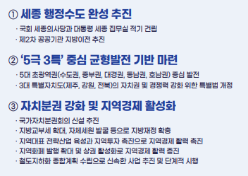 - 제2차 공공기관 지방이전, 지자체 통합, 지역대표 산업 육성 등 자립형 지역경제 기반을 강화합니다.