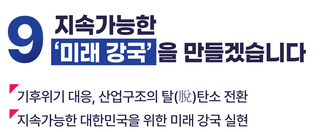21대 대통령 선거 10번째 대선 공약으로 기후위기를 국가적 위협으로 인식하고, 2030년 온실가스 감축목표 달성과 함께 2035년 이후 중장기 로드맵을 과학적 근거에 따라 수립합니다.