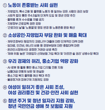 - 주 4.5일제 도입 등 노동시간 단축, 산재보험 사각지대 해소, 여성·장애인 노동자 보호 등 포괄적인 노동환경 개선을 추진합니다.
