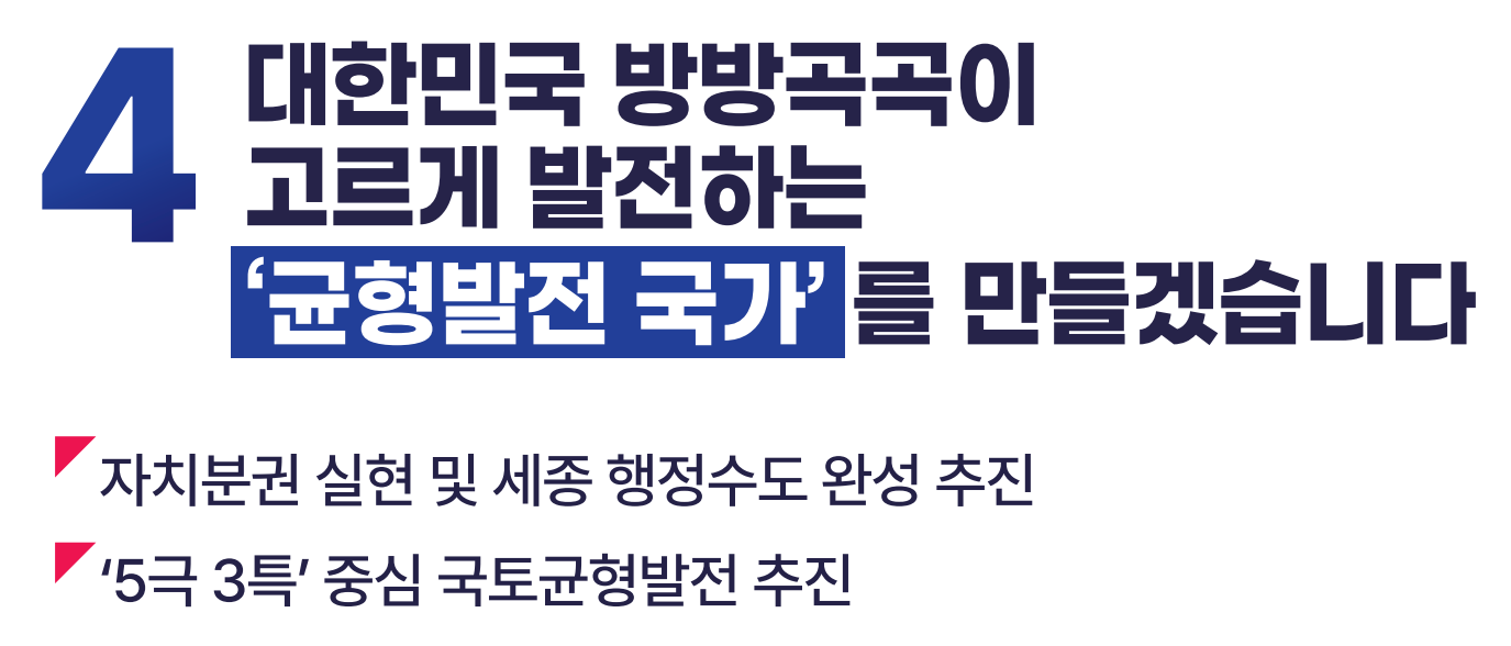 21대 대통령 선거 6번째 대선 공약으로 세종의사당과 대통령 집무실을 조기에 구축하여 세종 행정수도를 완성하고, 5대 초광역권 및 3대 특별자치도를 중심으로 균형발전을 추진합니다.