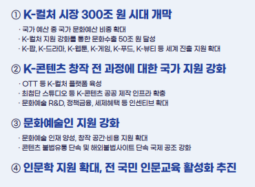 - K-콘텐츠의 세계화, 창작자 권리 보호, K-컬처 플랫폼 강화 등으로 문화강국을 실현합니다.