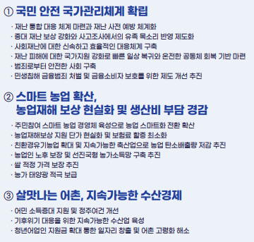 - 청년 주거·일자리 지원과 함께 농어촌 소득 안정, 문화패스 확대 등 전 세대를 아우르는 복지정책이 마련됩니다.