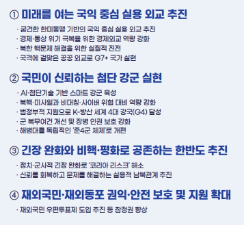- 공급망 조기경보, 무역안보 체계 정비, 전략물자 확보 등으로 경제안보를 강화하며, 재외국민 보호, 이산가족 상봉, 기후외교 등 국제사회에서의 역할도 확대됩니다.