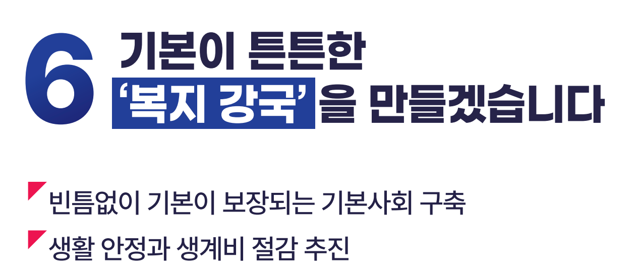 - 배달수수료 상한제, 가맹점주 권익 강화 등 공정 유통구조를 구축하고, 공공임대 확대 및 전세사기 방지로 주거안정을 실현합니다.