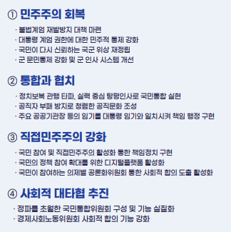 - 공공기관의 임기 일치, 공직자 이해충돌 방지 등 청렴한 행정체계도 포함됩니다.