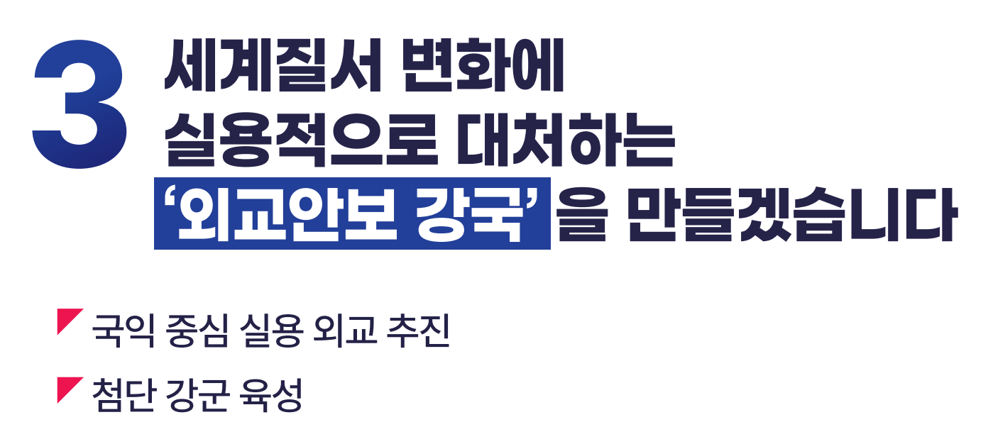 - 북한과의 대화 재개, 군사 신뢰 구축, 한미동맹 기반 전방위 억제체계로 한반도 평화를 실현합니다.
